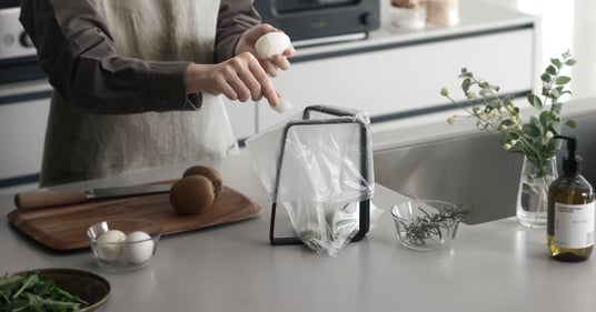 用途は生ゴミ入れの他に、食材を袋に入れて下味をつける際や、作り置きした料理を保存袋に移し替える際のスタンドとして、さらには食卓でのゴミの一時置きなど、様々な場面で活躍します。