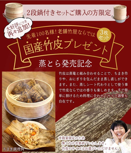 大好評につきさらに100名様分を追加決定!竹虎オリジナル杉蒸篭「蒸とら」2段鍋付きセットの購入者へ国産竹皮3枚をプレゼントいたします。杉蒸篭と竹皮を組み合わせて、中華ちまき作りへの活用もおすすめ!
