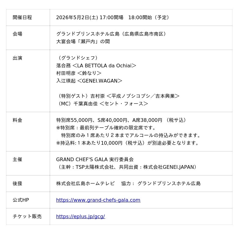 GRAND CHEF’S GALA 実行委員会(TSP太陽株式会社:以下当社、株式会社GENEI.JAPAN)は、東京のスターシェフと開催地域特有の食材を掛け合わせたプレミアムディナーイベント「GRAND CHEF’S GALA in Hiroshima 2026 Spring」(グランド シェフズ ガラ、以下本イベント)を、2026年5月2日(土)にグランドプリンスホテル広島にて開催いたします。