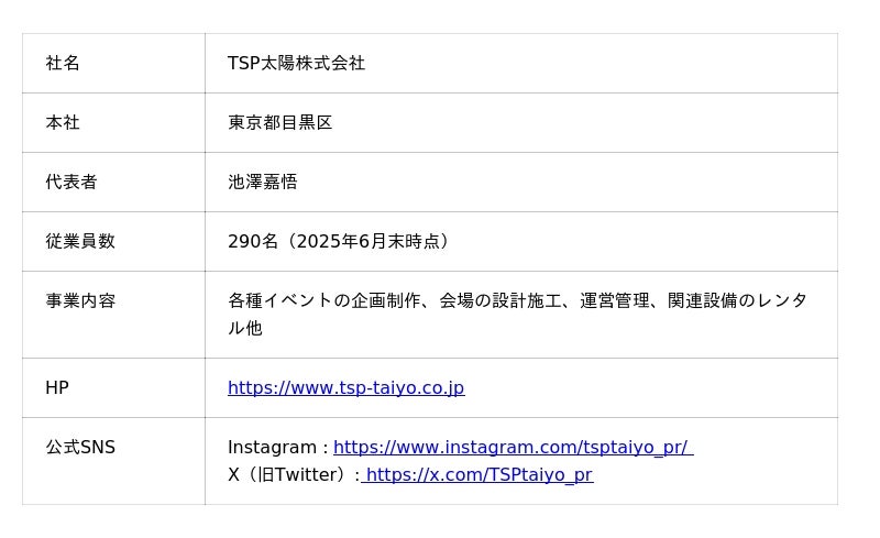 2025年で設立70周年を迎えたTSP太陽株式会社は、空間ソリューションによるイベントコンサルティングから企画・制作まで、あらゆる感動の場を一気通貫した支援で創造するプロフェッショナル集団です。国際的なビッグイベントを始め、あらゆるイベントに携わるデザイン・コンサルティング会社として、収益の最大化を図る事前収支計画から企画・クリエイティブ制作・建築設計・施工・運営までをトータルソリューションとして提供しています。PR・プロモーション・イベントに付随するホスピタリティサービスもお任せください。近年では、豊富な経験から培われた独自のノウハウを駆使し、ダイバーシティやSDGs・ESGへの取り組みを積極的に推進しています。