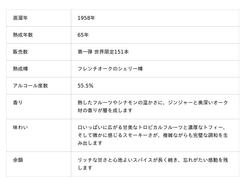 その類いまれなる熟成期間と希少性から、ウイスキー愛好家やコレクターにとっても注目を集める一本です。