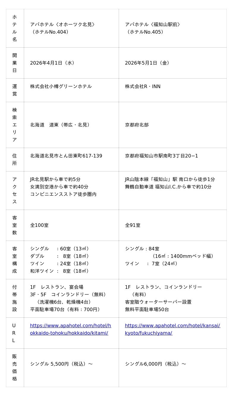 アパホテルネットワークとして全国最大の1,056ホテル・142,650室(建築・設計中・海外、アパ直参画ホテルを含む)を展開するアパホテル株式会社(本社:東京都港区赤坂3丁目2‐3 社長 元谷 芙美子)は、フランチャイズ契約を締結したアパホテル〈オホーツク北見〉(現:北見プラザホテル)、アパホテル〈福知山駅前〉(現:アールイン福知山)の開業日を決定し、アパ直(公式サイト・アパアプリ) における先行販売を開始する。