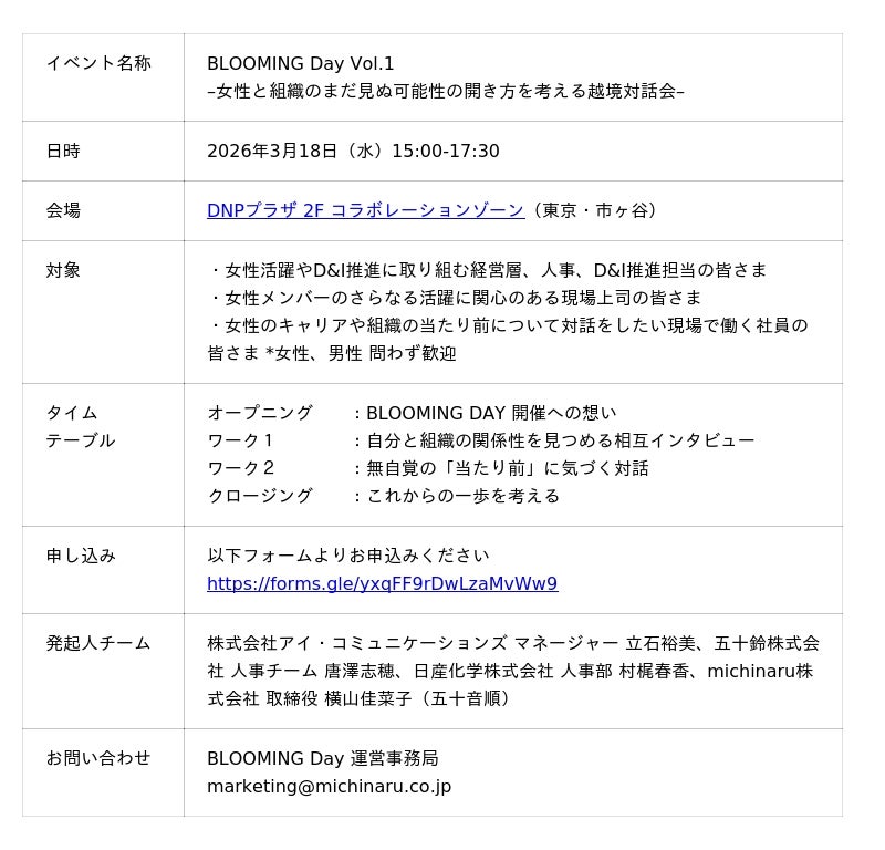 michinaru株式会社(本社:東京都千代田区、代表取締役:菊池龍之)は、企業の枠を越えて立ち上がった「BLOOMプロジェクト」の発起人チームとともに、国際女性デーに寄せて「BLOOMING DAY Vol.1 -女性と組織のまだ見ぬ可能性の開き方を考える越境対話会- 」を2026年3月18日(水)にDNPプラザ・コラボレーションゾーン(東京・市ヶ谷)にて開催いたします。