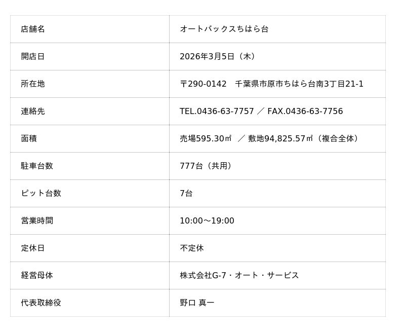株式会社オートバックスセブン(代表取締役 社長:堀井勇吾)と加盟店契約を結んでいる株式会社G-7・オート・サービス(代表取締役:野口真一)は、2026年3月5日(木)に「オートバックスちはら台」を新規オープンいたします。