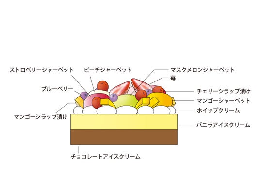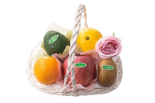 ふじ〈青森県産〉、ニューサマーオレンジ〈愛媛県産〉またはニューサマーグリーン〈静岡県産〉または小夏〈高知県産〉、オレンジ〈アメリカまたはエジプト産〉、アボカド〈メキシコ産〉、サンゴールドキウイ〈ニュージーランド産〉、バラオーナメント×各1
