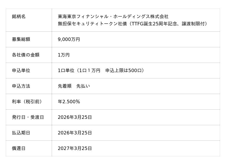 CHEER証券株式会社(代表取締役社長:小林伸行、以下「当社」)は、2026年3月11日(水)より、東海東京フィナンシャル・ホールディングス株式会社(代表取締役社長:春日井博)が発行する「東海東京フィナンシャル・ホールディングス株式会社 無担保セキュリティトークン社債(TTFG誕生25周年記念、譲渡制限付)」(以下「本ST社債」)の販売を開始することをお知らせいたします。