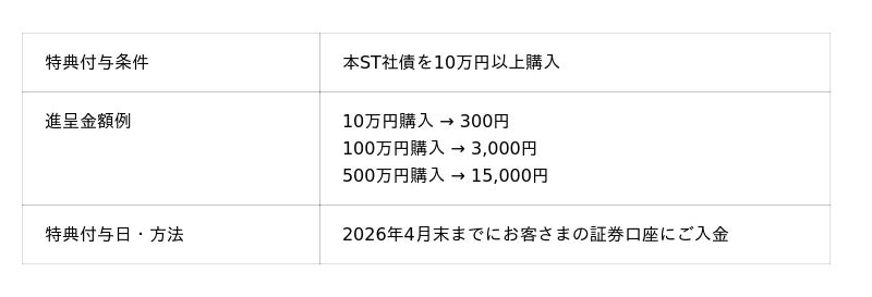 本ST社債をご購入いただいたお客さまへ、購入金額の0.3%分の投資資金を進呈いたします。