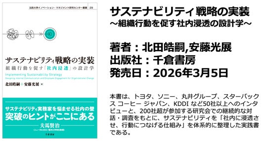本書は、トヨタ、ソニー、丸井グループ、スターバックス コーヒー ジャパン、KDDI など50社以上へのインタビューと、200社超が参加する研究会での継続的な対話・調査をもとに、サステナビリティを「社内に浸透させ行動につなげる仕組み」を体系的に整理した実践書です。サステナビリティを「きれいな理念」で終わらせず、現場の判断と行動を変え、戦略として実装したいすべての実務家向けの書籍にしました。