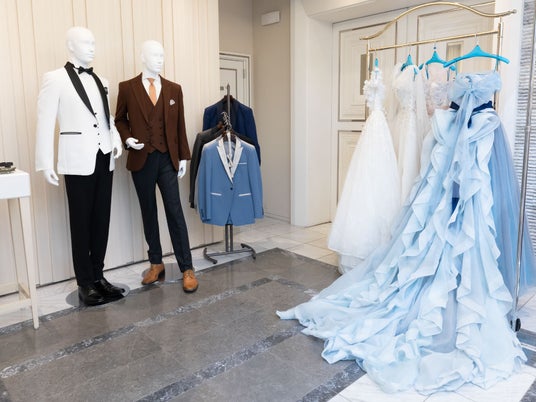 コーディネートされたレセプションコーナーと、人気のドレス・タキシード展示