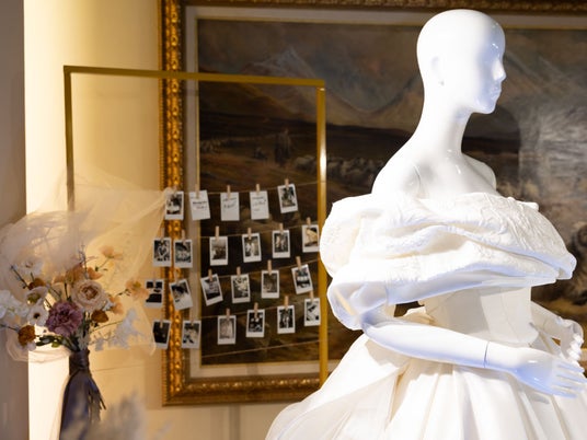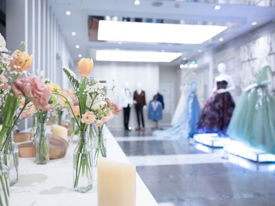 エントランスに設けられたウェルカムスペースと新作ドレスの展示