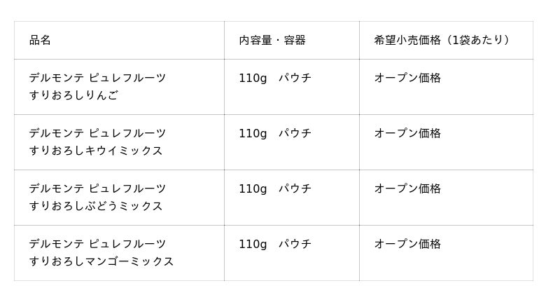 デルモンテはこの「ピュレフルーツ」シリーズで、「持ち運びができて、いつでもどこでも楽しめるフルーツ」という新たなフルーツの楽しみ方をご提案します。これからもデルモンテは、「太陽を、おいしさに。」をスローガンに、世界中からよりすぐった野菜・果実からつくる高品質な商品で、健康的な食生活を応援してまいります。