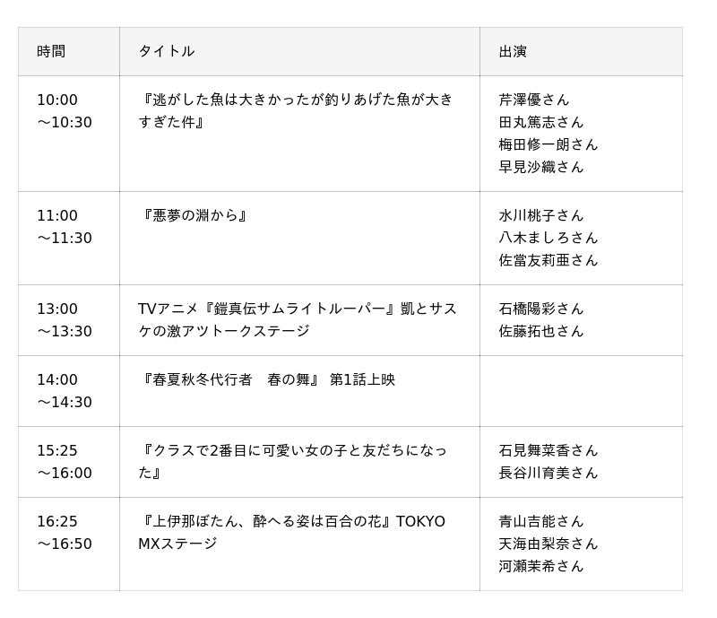 整理券 : 各ステージ実施日に、TOKYO MXブースにて配布予定