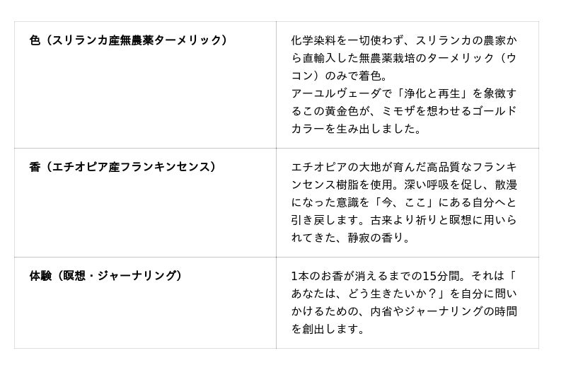 雑音を払い、自分自身の内面と深く向き合う瞑想やジャーナリングの時間。その傍らに、このお香を添えてみてください。立ち上る煙が、あなたの歩んできた道のりを肯定し、未来を照らす確かな光となることを願っております。