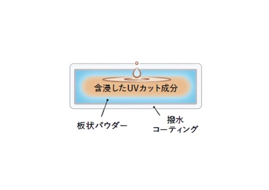 独自原料配合の「スーパーUVエアリーパウダー」により、高いUVカット力と透明感のある仕上がりを同時に実現。UVカット効果が高いほどありがちな厚塗りや白浮き感を払拭し、肌のアラをぼかしてクリアな肌に仕上げます。板状パウダーにUVカット成分(紫外線吸収剤)をしみ込ませ、撥水性成分でコーティングしているので、透明感のある仕上がりが⾧時間続きます。