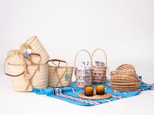 バスケットの中には、ファウンダーのトゥイトゥの母も愛用していたチュニジアの伝統的なスカーフ「Takrita」を使用したポーチが付属。このスカーフは単品でも展開しており、スカーフやバンダナとしてもお使いいただけます。
