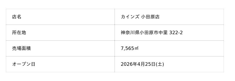 株式会社カインズ(本部:埼玉県本庄市、代表取締役社長 CEO:高家 正行)は、長年に渡りご愛顧いただいたカインズ 小田原高田店(神奈川県小田原市)を2026年3月29日(日) に閉店し、2026年4月25日(土)、ダイナシティ隣接地に新たに「カインズ 小田原店」をオープンすることをお知らせします。
