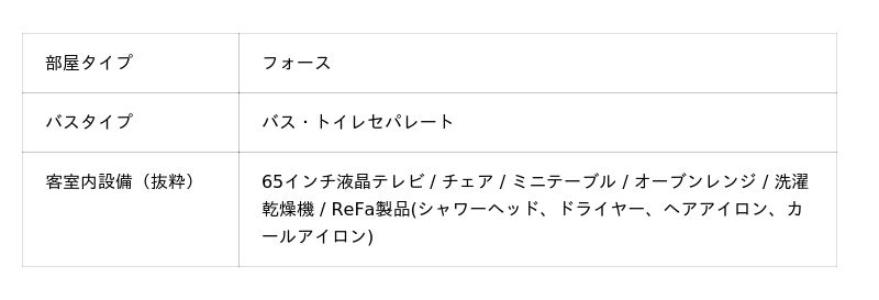 室内設備:全室43インチ以上の液晶テレビ(ミラーリング・動画配信サービス対応)、冷蔵庫、加湿空気清浄機、電気ケトル、マルチタイプ携帯充電器、セーフティボックス、消臭スプレー など(全室/無料)