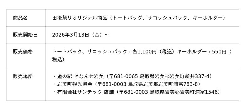 一般社団法人日本昔ばなし協会が取り組む「海ノ民話のまちプロジェクト」は、鳥取県岩美町の有限会社サンテックとコラボし、「田後祭りオリジナル商品」を発売いたします。ラインナップはトートバッグ、サコッシュバッグ、キーホルダーの3商品。2026年3月13日(金)より、道の駅きなんせ岩美、岩美町観光協会、サンテック店舗の3箇所にて販売を開始します。各商品には、岩美町田後地区に伝わる民話『海の神様』のアニメーションの名場面をデザイン。作品の魅力が詰まった愛らしいキャラクターたちをお楽しみいただけます。