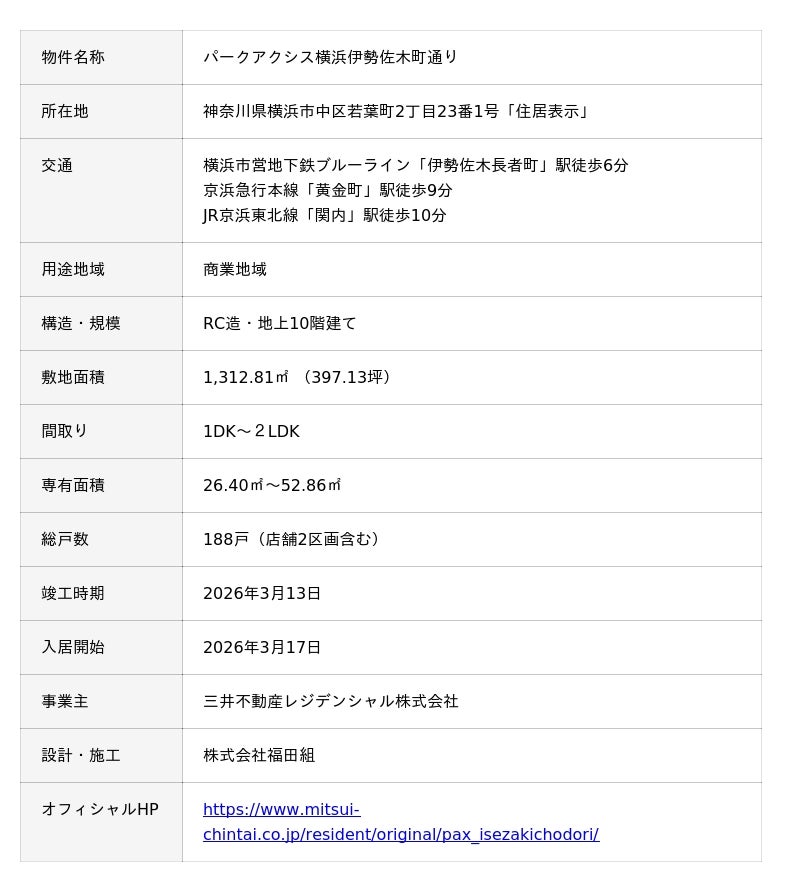 三井不動産レジデンシャル株式会社(本社:東京都中央区、代表取締役社長:嘉村 徹、以下「三井不動産レジデンシャル」)は、DXYZ株式会社(本社:東京都新宿区、代表取締役社長:中西 聖、以下「DXYZ」)と協業した賃貸レジデンス、「パークアクシス横浜伊勢佐木町通り」が2026年3月13日(金)に竣工したことをお知らせします。