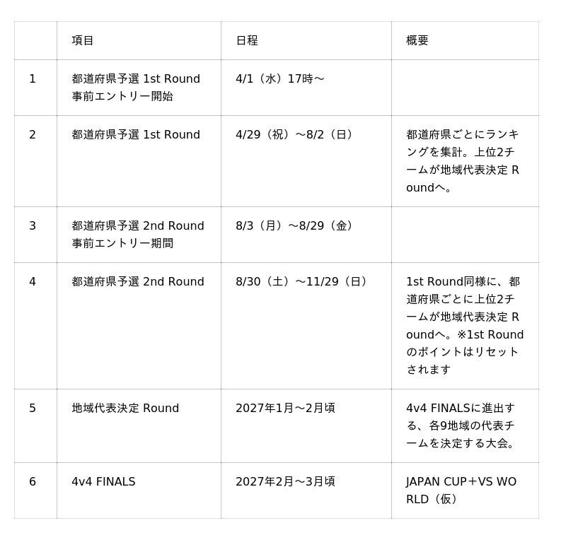 今シーズンは大会ランク制度を廃止し、ランク別ポイントを撤廃。全チームが同じ指標で競い合えるよう、すべての大会の獲得ポイントを一本化いたします。さらに予選を都道府県ごとの「1st Round」「2nd Round」の2ラウンド制へと変更すると共に全地域で進出条件を統一し、チャンスを拡大。さらに新たに設置される「地域代表決定 Round」から「4v4 FINALS」へと続く、頂点への明確な道筋が、子どもたちの闘志をいっそう熱く燃え上がらせる仕組みへリニューアルします。