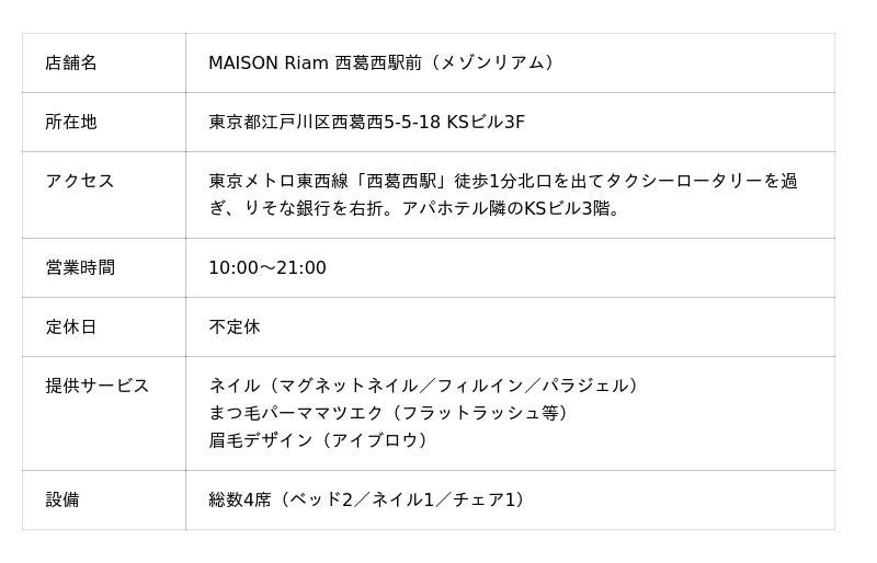 ネイル・アイビューティーサロンを展開する株式会社マリエス(所在地:千葉市|代表取締役:鈴木万梨江)は、2026年3月1日、東京都江戸川区西葛西にネイル・まつ毛・眉毛のトータルビューティーサロン「MAISON Riam 西葛西店(メゾンリアム)をオープンしました。
