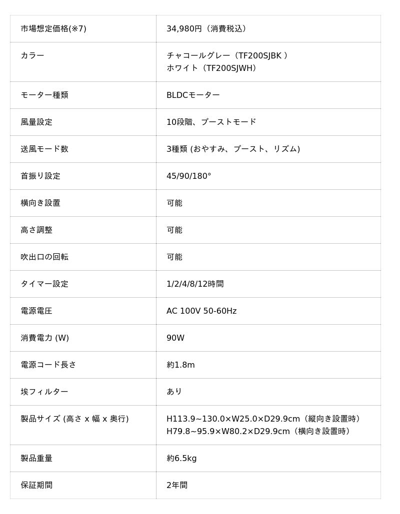 「 Shark(R) TURBOBLADE ハイパワータワーファン」主要スペック