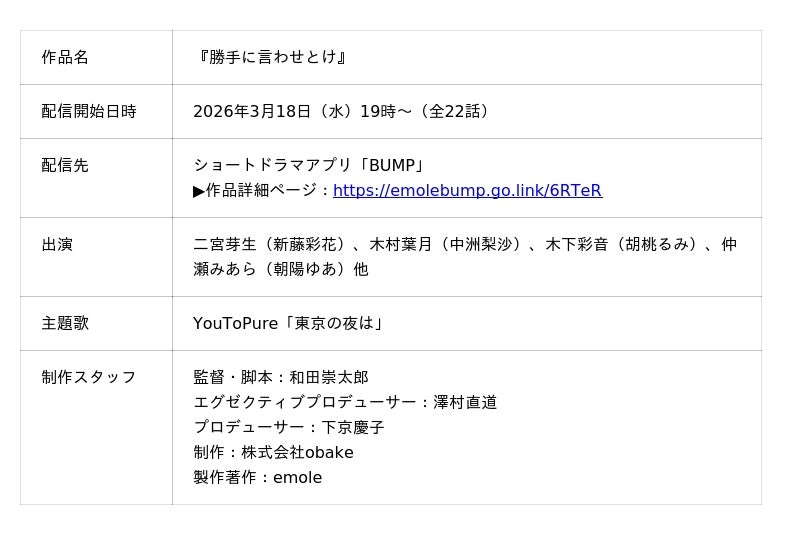 ショートドラマアプリ「BUMP」を運営する emole 株式会社(本社:東京都目黒区、代表取締役:澤村直道、以下 emole)は、BUMP オリジナルショートドラマ『勝手に言わせとけ』を2026年3月18日(水)19:00よりBUMP独占配信いたします。