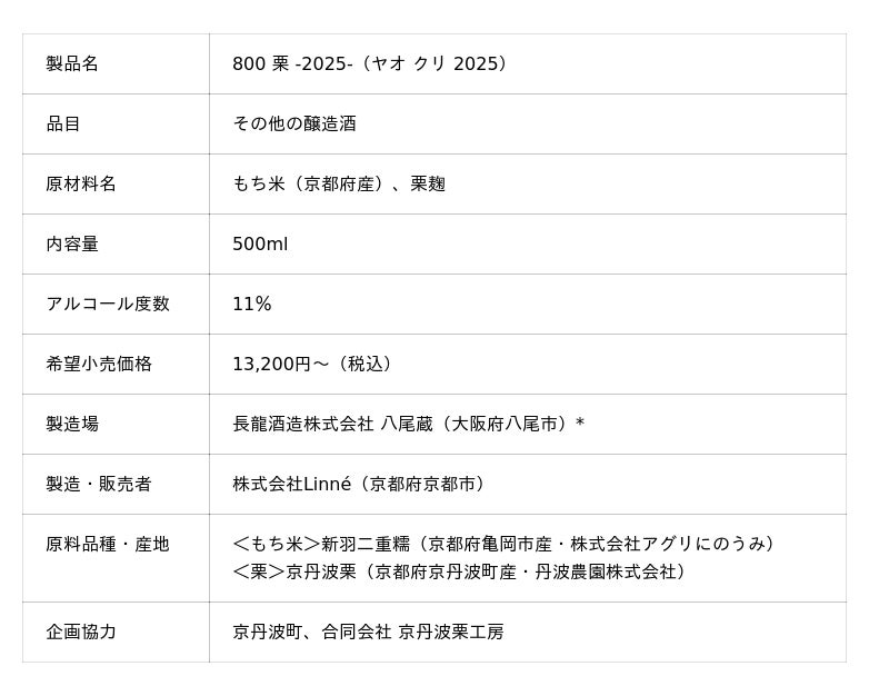 酒造りを起点に食文化を醸すファーメンテーション・コレクティブ(発酵集団)、株式会社Linne(リンネ)【本社:京都府京都市、代表取締役:今井翔也、以下LINNE】は、2025年収穫の京丹波栗を麹原料に用いた醸造酒《800 栗(ヤオ クリ) -2025-》を、2026年3月19日より発売いたします。