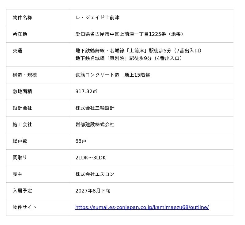 株式会社エスコン(本社:東京都港区、代表取締役社長:伊藤貴俊)が名古屋市中区において手がける、新築分譲マンション『レ・ジェイド上前津』につきまして、2026年3月23日(月)より分譲開始いたしますので、お知らせいたします。当物件は、大須商店街から徒歩5分の場所に位置する買物利便性に優れたレジデンスです。