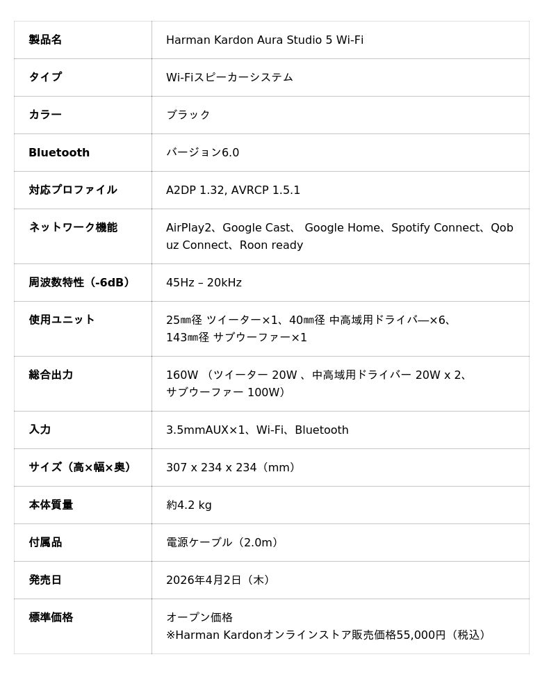 ハーマンインターナショナル株式会社(本社:東京都千代田区、代表取締役社長:桑原拓磨)は、優れた音響技術と洗練されたデザインの融合で世界中の音楽ファンから愛されるオーディオブランド「Harman Kardon (ハーマンカードン)」から、新たにWi-Fi機能を内蔵した全方位型ワイヤレスホームスピーカー「Aura Stidio 5 Wi-Fi」を2026年4 月2日(木)より発売いたします。