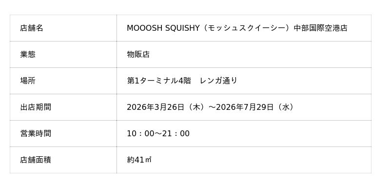 中部国際空港セントレア(所在:愛知県常滑市)では、第1ターミナル4階レンガ通りに、スクイーズ専門ブランド「MOOOSH SQUISHY(モッシュスクイーシー)」が2026 年3 月26日(木)から7 月29日(水)までの期間限定でオープンしました。中部エリアでは初の出店となります!!