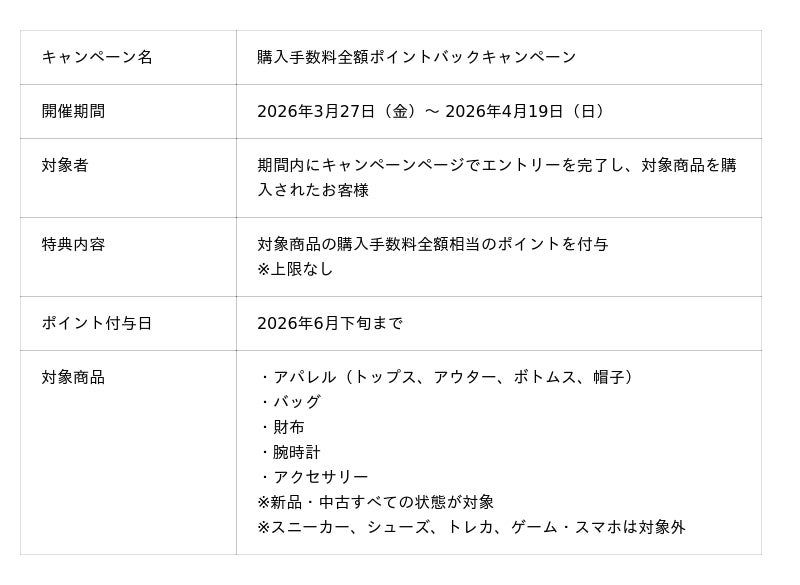 本キャンペーンでは、期間中、エントリーのうえ、「アパレル」「バッグ」「財布」「腕時計」「アクセサリー」カテゴリーのうち、対象ブランドを除くすべての商品を対象に、上限なしで購入手数料の全額分をポイント還元いたします。人気ブランドのアイテムをはじめ、アパレルだけでなくバッグやアクセサリーなども対象となるため、春の衣替えや新生活に合わせ、より多くのお客様にスニダンでのお買い物をお楽しみいただけるキャンペーンとなっています。