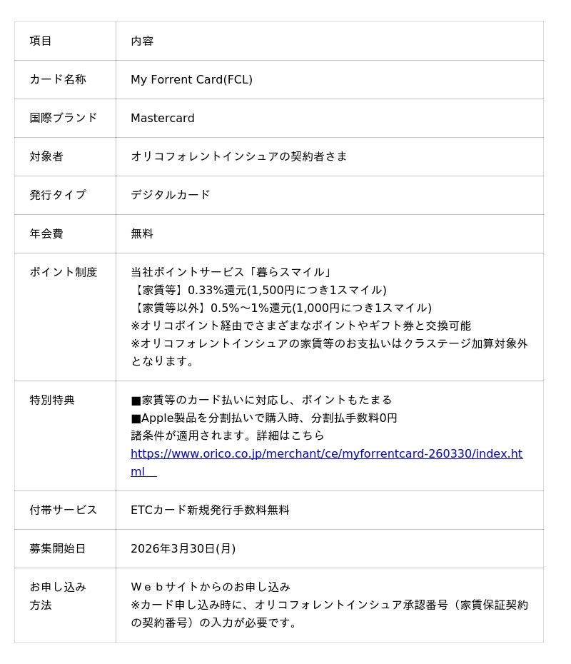 株式会社オリエントコーポレーション(本社:東京都千代田区、代表取締役社長:梅宮 真、以下「オリコ」)は、2026年3月30日より家賃、管理費、駐車場料金、保証料等(以下「家賃等」)のクレジットカード払いに対応した「My Forrent Card」(以下、本カード)の申し込みを開始いたします。