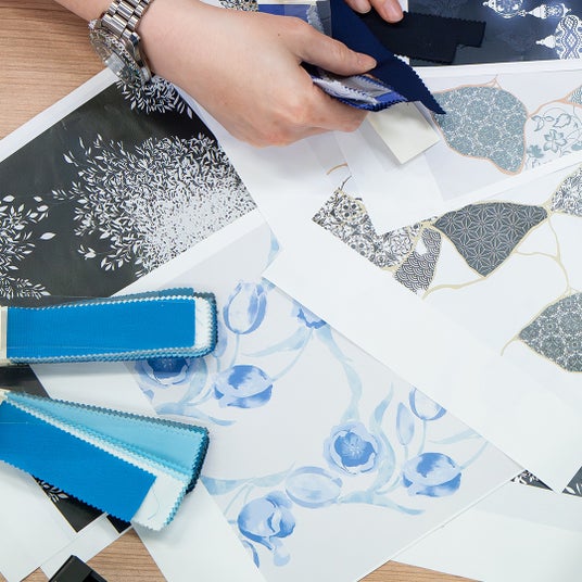 水墨画のような抜け感のあるタッチと、彩度を抑えた配色で「大人の上品さ」を演出。空間と柄の流れを感じさせるため、デザイン担当スタッフ自ら下絵を描いてやわらかく軽やかな雰囲気に仕上げました。