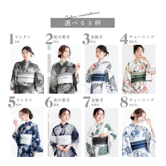 「浴衣としても、単衣着物としても美しく」 そんな思いから、性別や年齢を問わないボーダーレスで上品なデザインを目指しました。女性浴衣は4柄各2配色の全8種類、そのうち2柄各2配色の4種類は男性浴衣と共通デザインです。