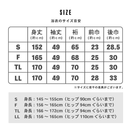 女性用浴衣のサイズはS、F、LL、TL、3L、4Lまで取り揃えております。