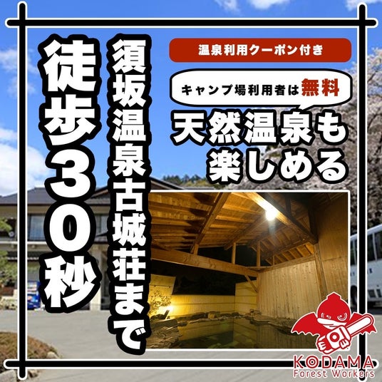 主な設備:キャンプサイト(Wi-Fi完備)、炊事場、水洗トイレ、温泉(徒歩30秒)、駐車場