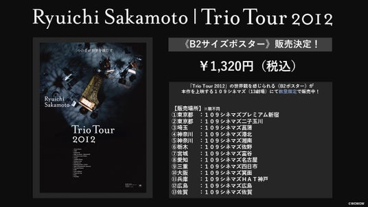 映画『Ryuichi Sakamoto | Trio Tour 2012』は、109シネマズプレミアム新宿、Bunkamuraル・シネマ 渋谷宮下を始め絶賛公開中。さらに、中学生以下を対象とした特別料金「Kizuna Price|キズナプライス」(900円)も実施。本作の世界観を体現したB2ポスターも109シネマズ(13館)限定で大好評販売中。詳細は公式HP参照。