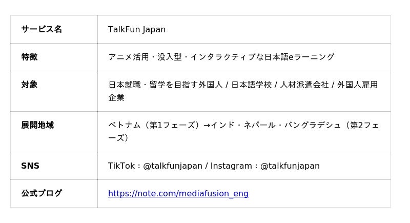 株式会社メディアフュージョン(本社:大阪市北区)は、アニメを活用した日本語eラーニングシステム「TalkFun Japan」のアジア展開を通じて、2030年までにアジア全土で100万人が「アニメで日本語を学ぶ」世界をつくることを、本日ここに宣言します。
