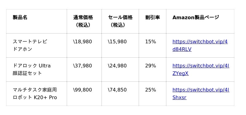 ※本価格表はAmazon公式ストア掲載情報を基に作成しています。他のSwitchBot公式ストアでは、価格や各種条件が異なる場合があります。
