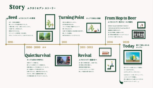 2011年に転機が訪れます。東日本大震災をきっかけに岩手県出身の村上氏の「ホップで東北に貢献する」という想いから「江刺7号」の量産化と社会実装に舵を切り、眠っていた品種は、再び光を浴びることになりました。「ムラカミセブン」という名で新しい可能性を探り始めます。その後、2016年には直営店の「スプリングバレーブルワリー東京」で「MURAKAMI SEVEN Fresh Hop 2016」が数量限定で提供されるなど、その価値が徐々に広がっていきました。こうして受け継がれてきた日本産ホップ「ムラカミセブン」の魅力を背景に、香りでビールを楽しむという新たな発想を広げるため、「JAPANエール 香」はリニューアルを実施。日本産ホップ「ムラカミセブン」を増量し、香りの魅力をよりお楽しみいただける味わいへ進化しました。