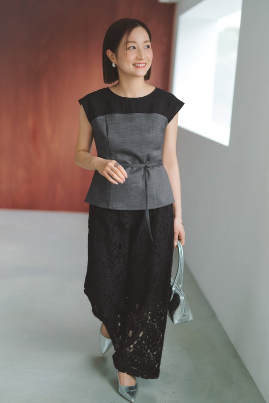 メリハリのあるバイカラーブラウスに、顔周りと揃えた黒のレースパンツを合わせた華やかな装い。