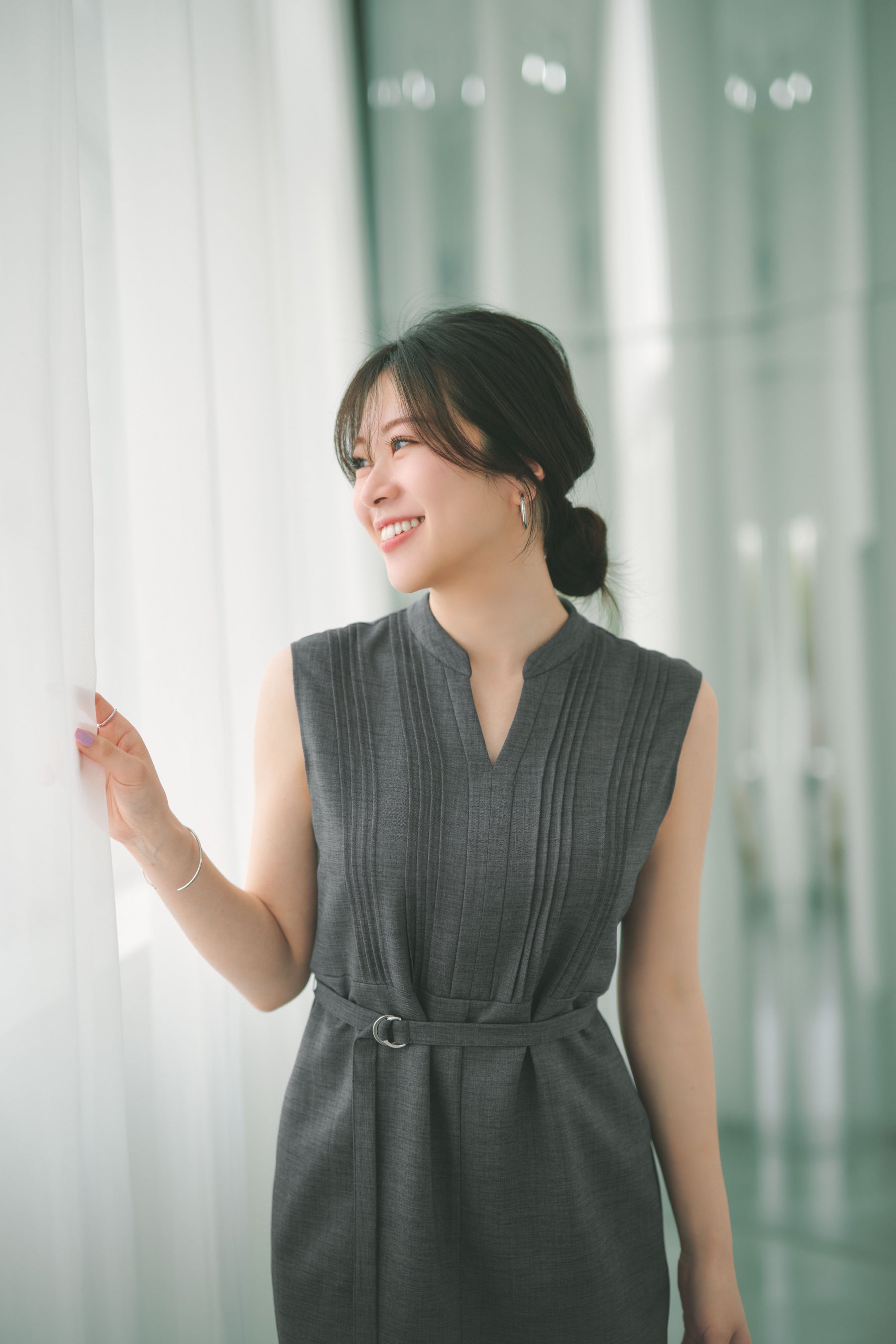 端正なジャケットとワンピースの組み合わせで、着るだけできちんと感と女性らしさを両立。