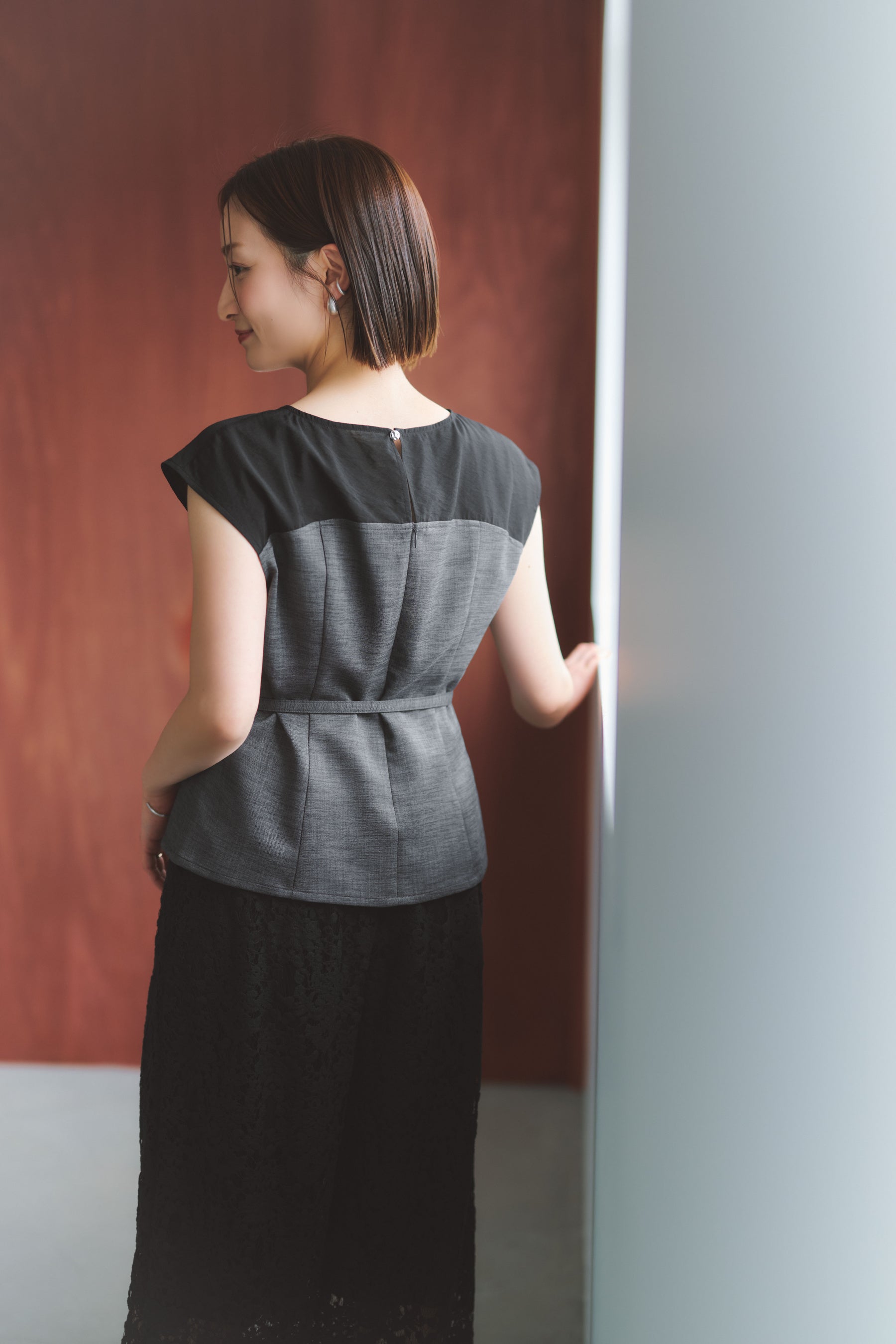 メリハリのあるバイカラーブラウスに、顔周りと揃えた黒のレースパンツを合わせた華やかな装い。