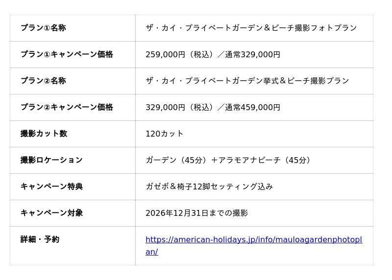 ハワイ専門のウェディングフォト・フォトウェディングサービスを提供する株式会社アメリカンホリデーズ(本社:東京都江東区、代表取締役:遠藤 秀登)は、同社初となるガーデン撮影プラン「ザ・カイ・プライベートガーデン&ビーチ撮影フォトプラン」の提供を開始しました。オアフ島ハワイカイエリアに位置する完全貸切型プライベートガーデンとビーチの2ロケーションで撮影を行う本プランは、新プラン誕生記念のキャンペーン価格259,000円(税込)から利用できます。併せて、ガーデンでの本格挙式とビーチ撮影がセットになった「ザ・カイ・プライベートガーデン挙式&ビーチ撮影プラン」(キャンペーン価格329,000円・税込)も提供を開始しています。詳細は以下のとおりです。