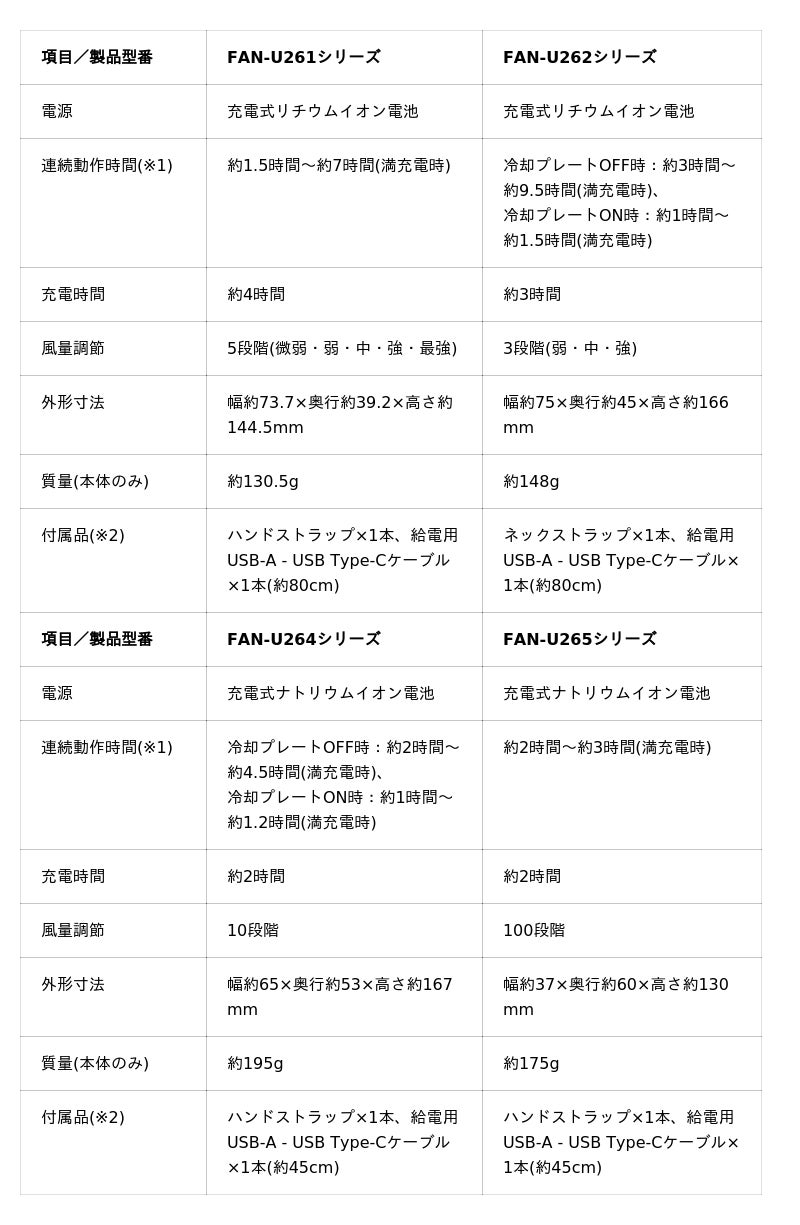 – ナトリウムイオン電池採用モデルを2モデル(FAN-U264・FAN-U265シリーズ)ご用意。サイクル寿命は約5,000回で、一般的なリチウムイオン電池に対して約10倍の長寿命。買い替えの手間が減って、暑い夏の相棒として長く活躍します。