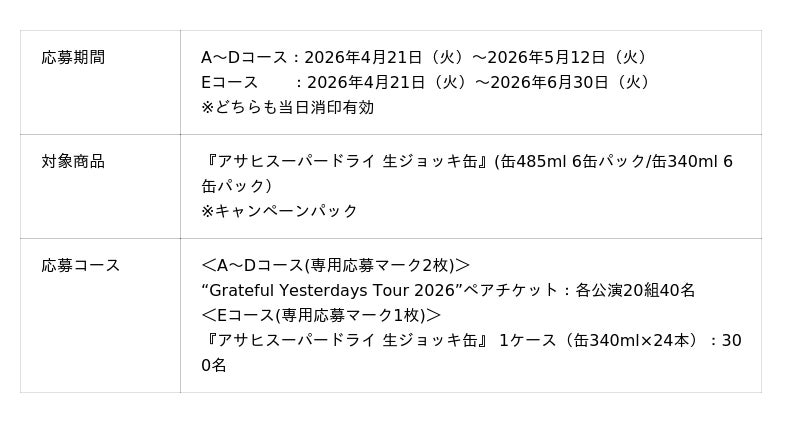同日から発売する対象のキャンペーンパックを購入して応募すると、「back number」のペアチケットが各公演20組40名に、また『アサヒスーパードライ 生ジョッキ缶』1ケース(缶340ml×24本)が300名に当たります。