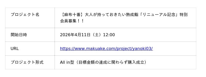 今回のプロジェクトは、2026年5月10日に予定している店名変更(「鮨楽座 八の樹」→「麻布十番 鮨やのき」)およびリニューアルオープンを記念して実施するもので、超早割価格23,000円~の熟成鮨おまかせコース(飲み放題付き)や、希少酒プレミアペアリングプラン、8名貸切プラン(188,000円)など、新店舗をいち早く体験できる特別リターンを用意しています。