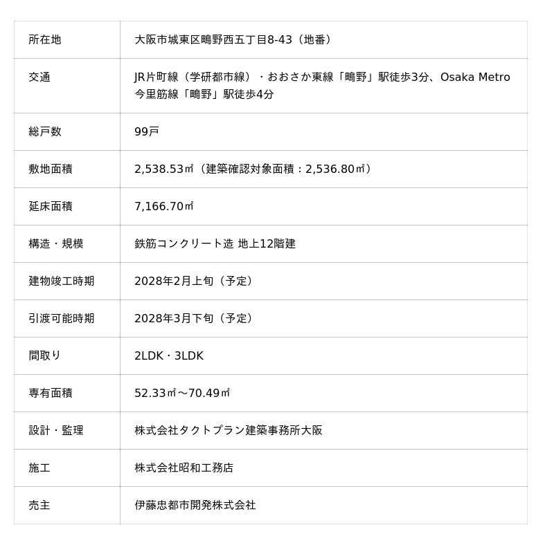 ・交通:JR片町線(学研都市線)・おおさか東線「鴫野」駅徒歩3分、Osaka Metro今里筋線「鴫野」駅徒歩4分