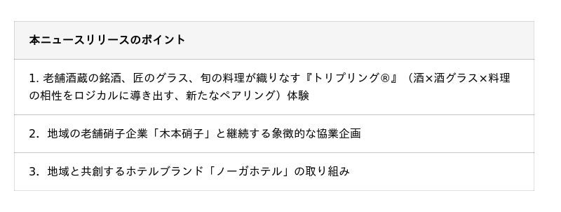 野村不動産ホテルズ株式会社(本社:東京都港区/代表取締役社長:平石浩介、以下「当社」)が運営する「ノーガホテル 上野 東京(以下「ノーガホテル上野」)」は、 2026年5月30日(土)にホテル内のレストラン「Bistro NOHGA(以下「ビストロ・ノーガ」)にて、日本酒をより美味しく味わうために、酒×酒グラス×料理の相性をロジカルにペアリングさせる一夜限りのトリプリングディナーを開催いたします。